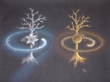 So sieht mein Wappen aus, dass Familienwappen ist ohne meinen Namen versteht sich. Es symbolisiert die Telperion, in einem Baum vereint (blau/rot) und die Äste fehlen. Die Blätter des Baumes liegen wie Sterne in der Luft.