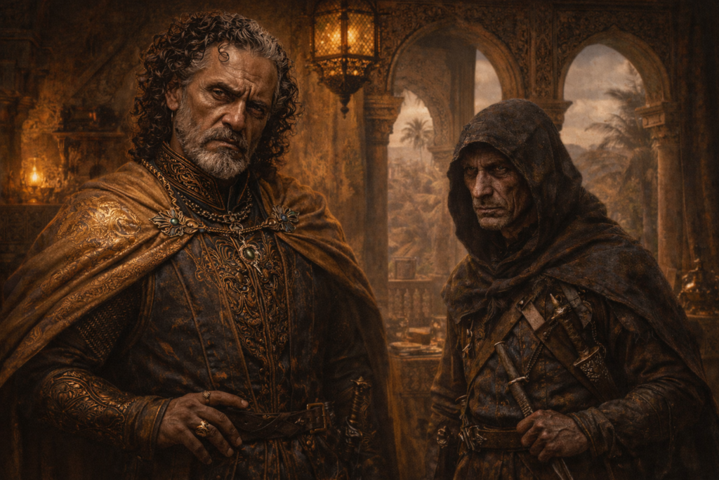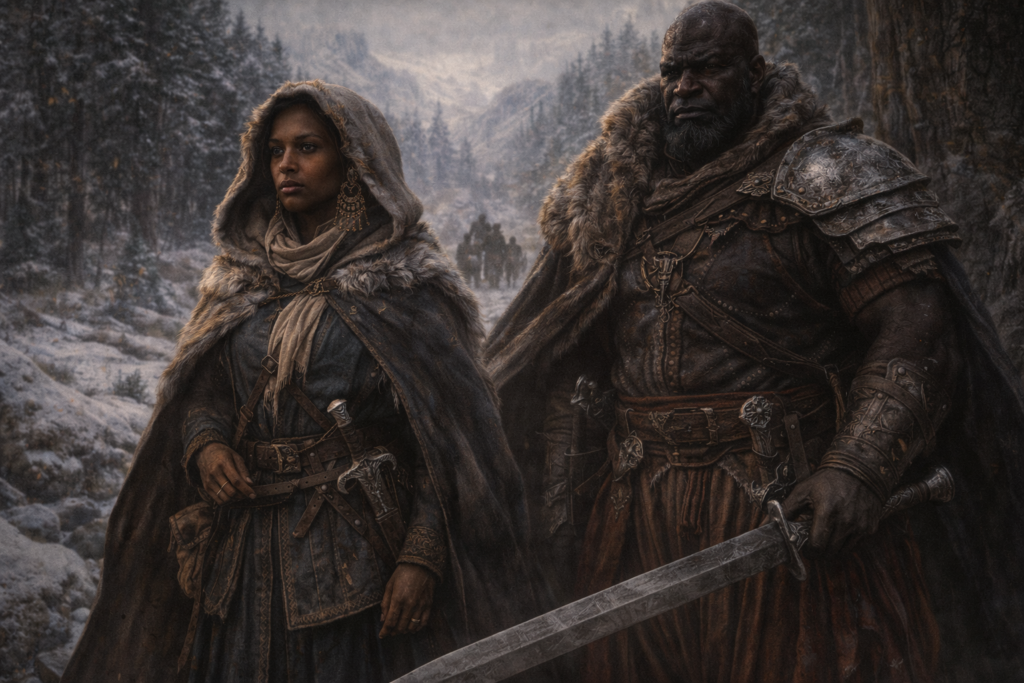 Die Gruppe Yngrid, Ares und Brandor traf Prinzessin Fatima aus Belakan, deren Begleiter Butu, ein Eunuch von gewaltiger Größe, ständig an ihrer Seite ist, einen Tagesritt nördlich von Buhr Waldlaes, auch genannt die Feuerstadt. Sie war auf dem Weg in den Norden.