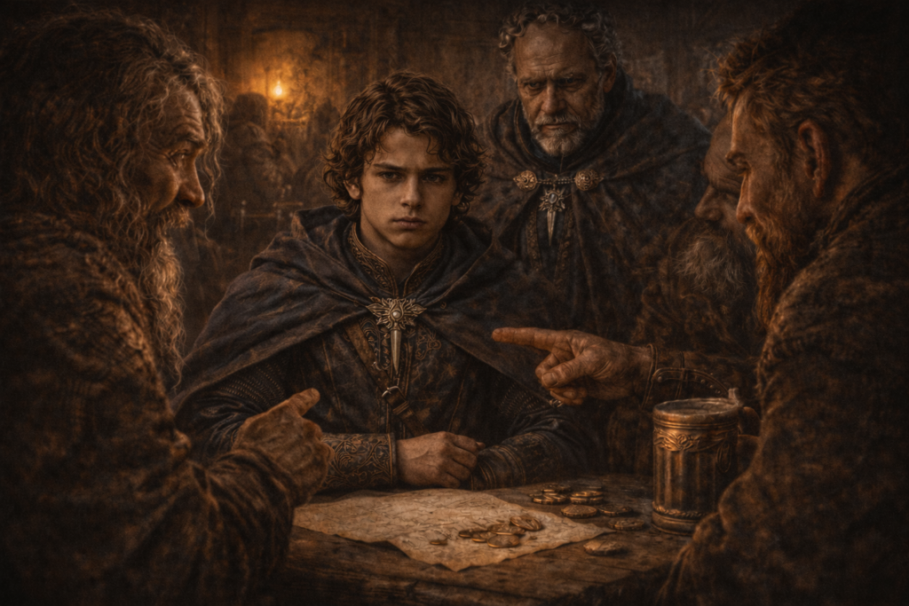 Dennoch erreichte der Treck Milmekil und zog dem Rufe des Goldes folgend zum einsamen Berg. Eloir wird von Warnell, einem gondorianischen Kämpen, begleitet, der sich mehr als nur verantwortlich für die Geschicke der Familie sieht.